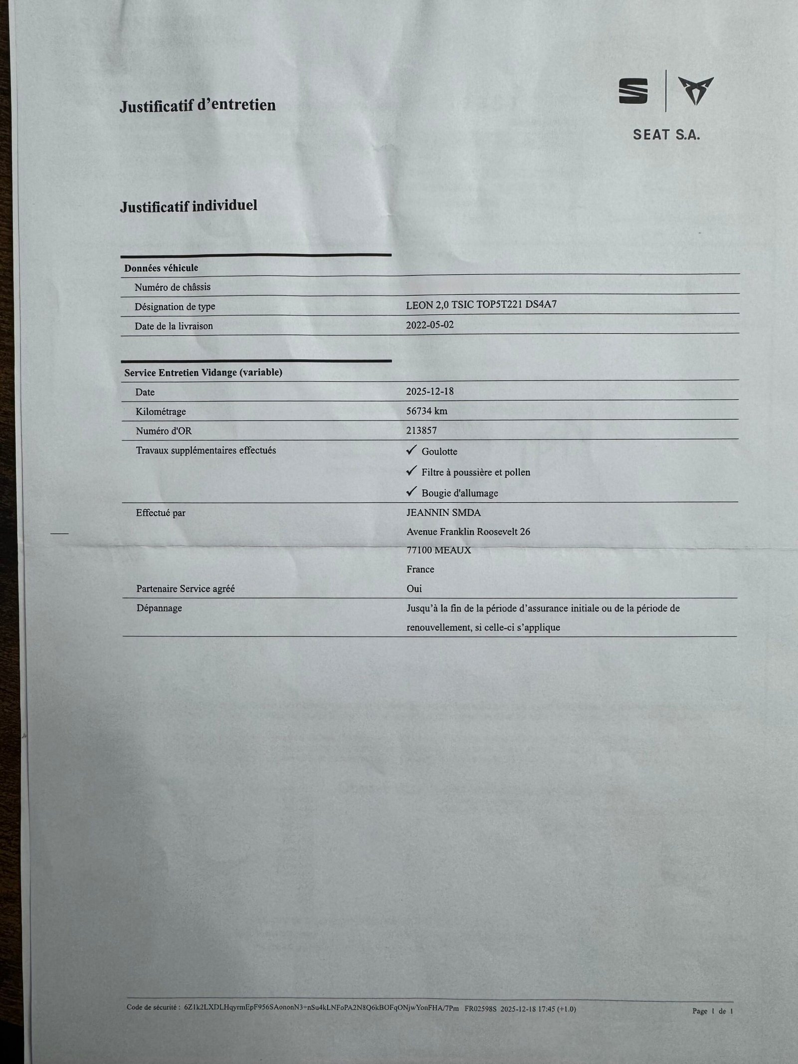 🛠️ Dernier entretien :