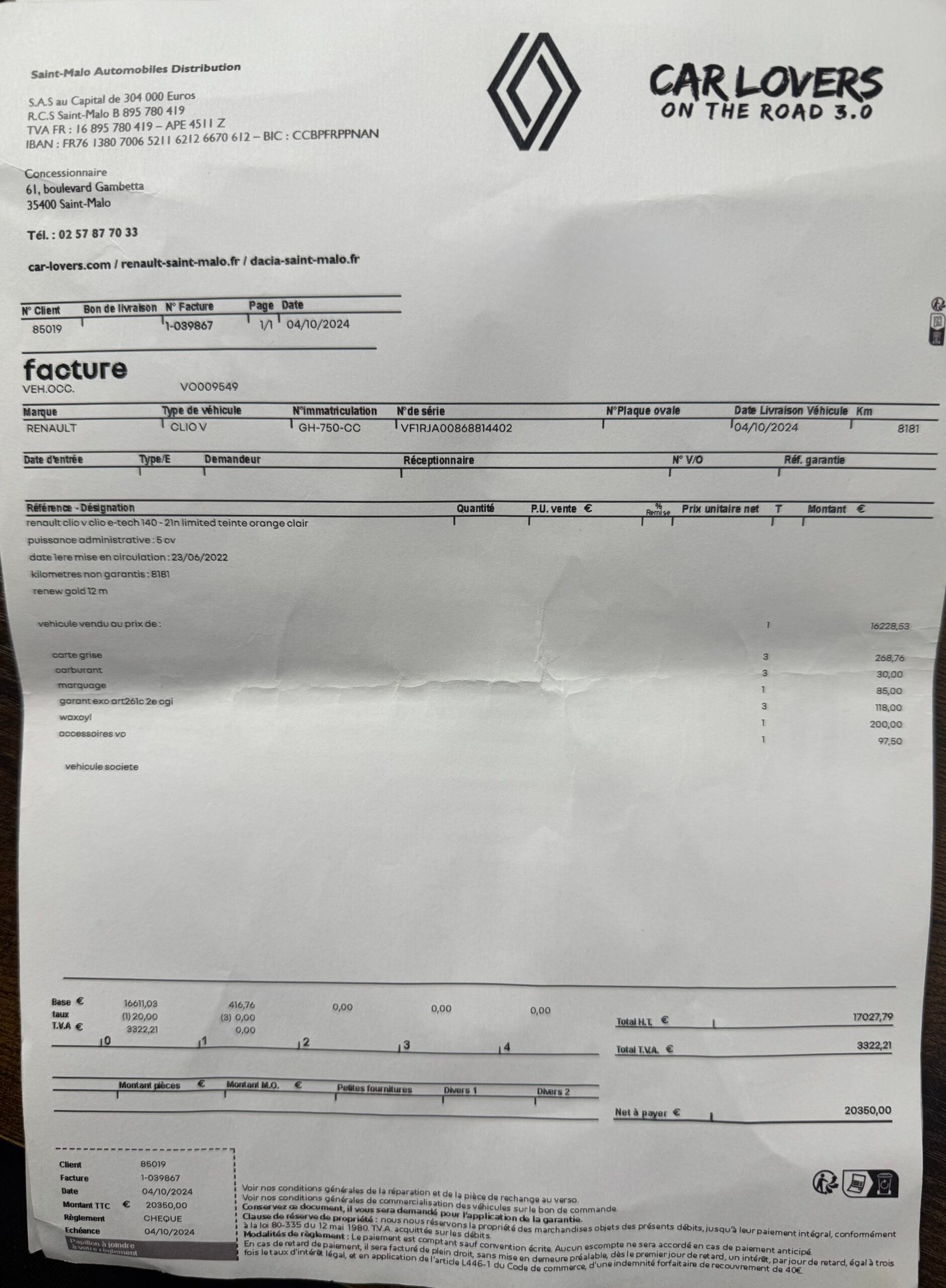 💵 HORS FRAIS DE MISE À LA ROUTE : (préparation du véhicule, carburant, édition de votre carte grise (hors chevaux fiscaux).